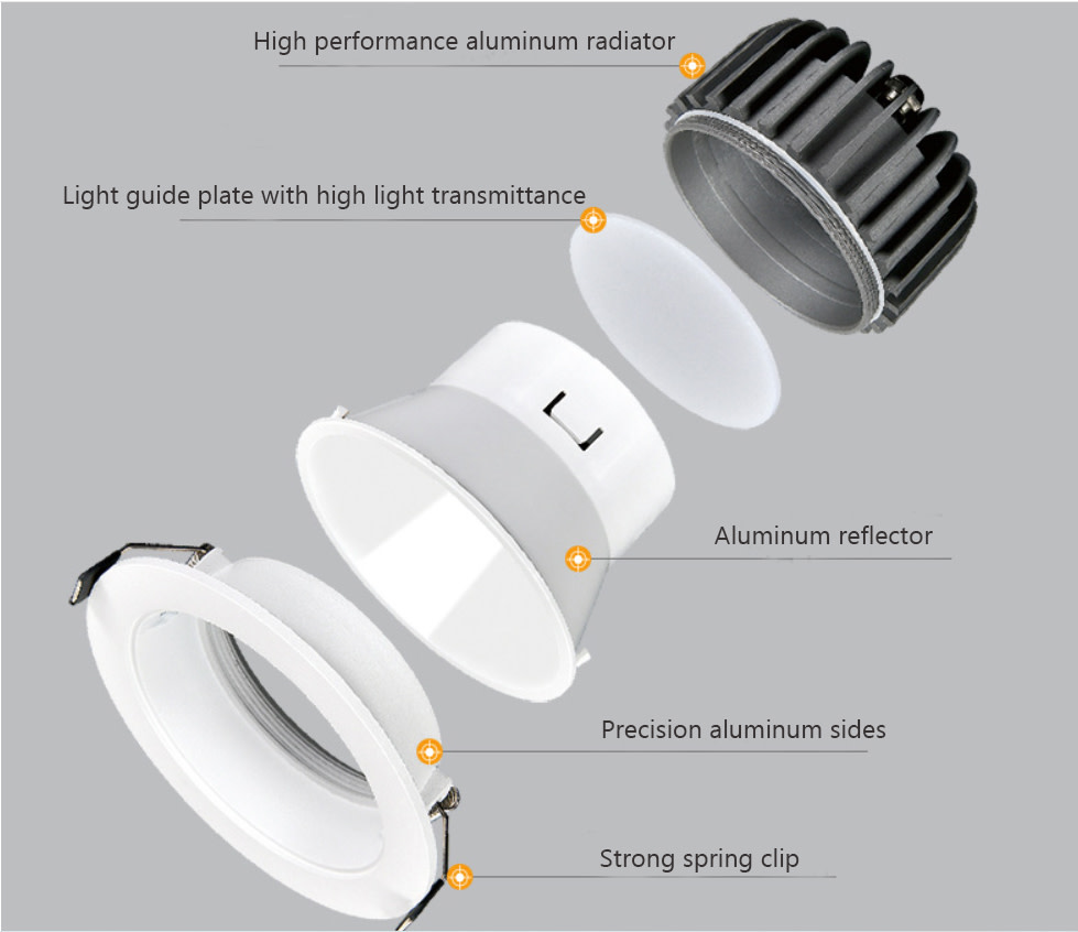 وتصميم الإطار الضيق يخالف القواعد (سمك الإطار 6 سم فقط). مؤشر تجسيد اللومين واللون للشريحة مرتفع للغاية مع عمر طويل. يمكن أن تصل قوته القصوى إلى 100 وات ودرجة حرارة اللون بين 2700 كلفن و6500 كلفن، لكن الوزن الإجمالي أقل من 1.5 كجم. والمشابك الثلاثة على الأطراف مصنوعة من الفولاذ المقاوم للصدأ، وهي قوية جدًا وجبار، مما يجعلها متينة وآمنة بعد التثبيت. تعتبر الإضاءة السطحيةLED بشكل عام، مثالية للاستخدام في غرف المعيشة وغرف النوم وغرف الدراسة والفنادق والأماكن الأخرى.