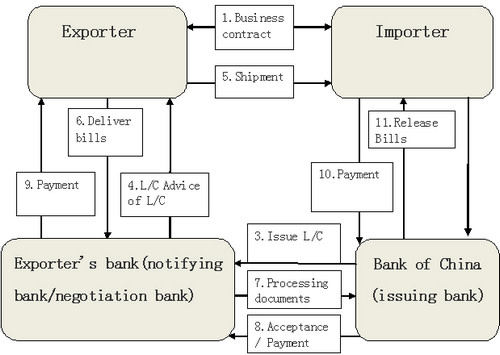 5) بعد مراجعة خطاب الاعتماد والعقد، يقوم المصدر بدفع قيمة البضاعة حسب العقد والحصول على مستندات الشحن، وإصدار فاتورة الحوالة وإرسالها إلى البنك المعتمد من قبل البنك المصدر (البنك المفاوض). التفاوض أثناء صلاحية خطاب الاعتماد. البنك المفاوض هو في الغالب البنك المصدر، والبنك المُخطر هو ايضا في بعض الأحيان البنك المفاوض.