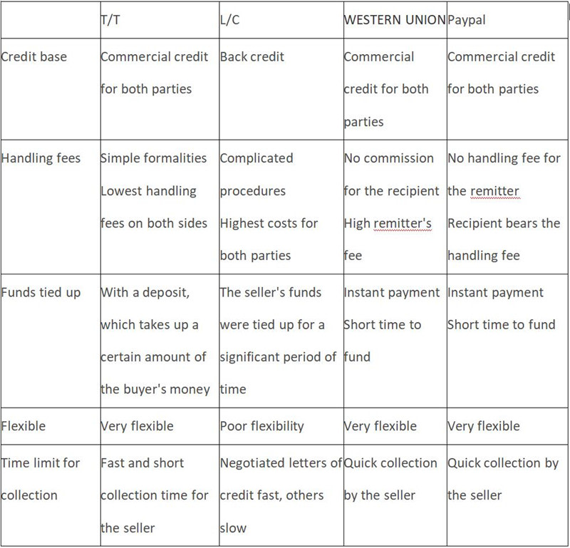 من خلال الجدول أعلاه، يمكننا أن نرى أن التحويل البنكي ويسترن يونيون وباي بال كلها تستند إلى الائتمان التجاري للمشتري والبائع، بينما تعتمد خطابات الاعتماد على الائتمان المصرفي. على الرغم من أن لديهم ميزة من حيث الجدارة الائتمانية، إلا أن هذا يجعل خطابات الاعتماد غير مرنة نسبيًا وتستغرق وقتًا أطول حتى يتم أخذ الأموال.