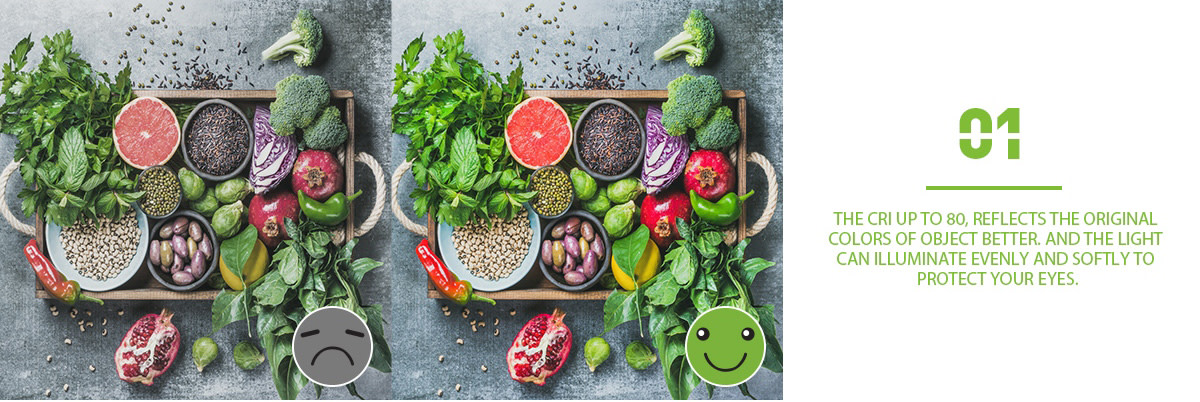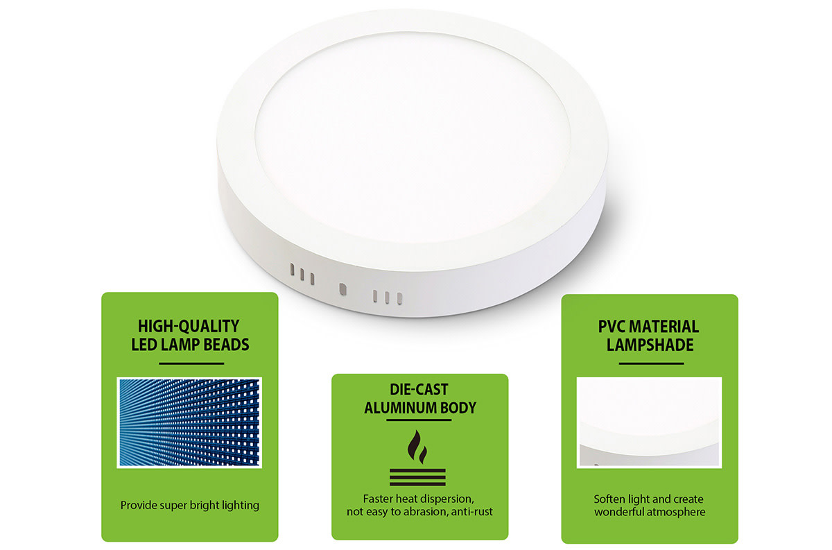 ثلاثة ألوان اختيارية: ضوء النهار الأبيض (3000K-3500K)، أبيض طبيعي (4000K-4500K)، أبيض دافئ (5500K-6000K)، مثالي للمكتب، الحمام، المطبخ، المعرض، السوق، إلخ، مشاهد مختلفة.