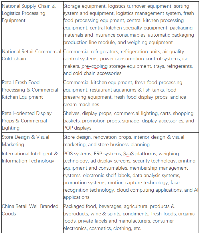 يغطي نطاق معرض الصين للبيع بالتجزئة العلامات التجارية الراقية للبيع بالتجزئة في الصين، وسلسلة التبريد لتجار التجزئة في الصين، وسلسلة التوريد ومعدات معالجة الخدمات اللوجستية، وسلسلة التبريد التجارية للبيع بالتجزئة، ودعائم العرض الموجهة للبيع بالتجزئة، والإضاءة التجارية، وما إلى ذلك. فئات المنتجات مذكورة أدناه.