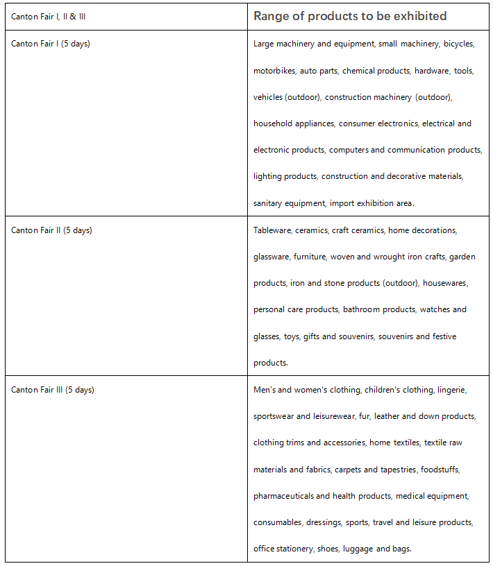 أدناه يظهر فئات المنتجات لكل مرحلة، مع المنتجات الإلكترونية التي تنتمي إلى المرحلة الأولى، أي العرض في بداية معرض كانتون.