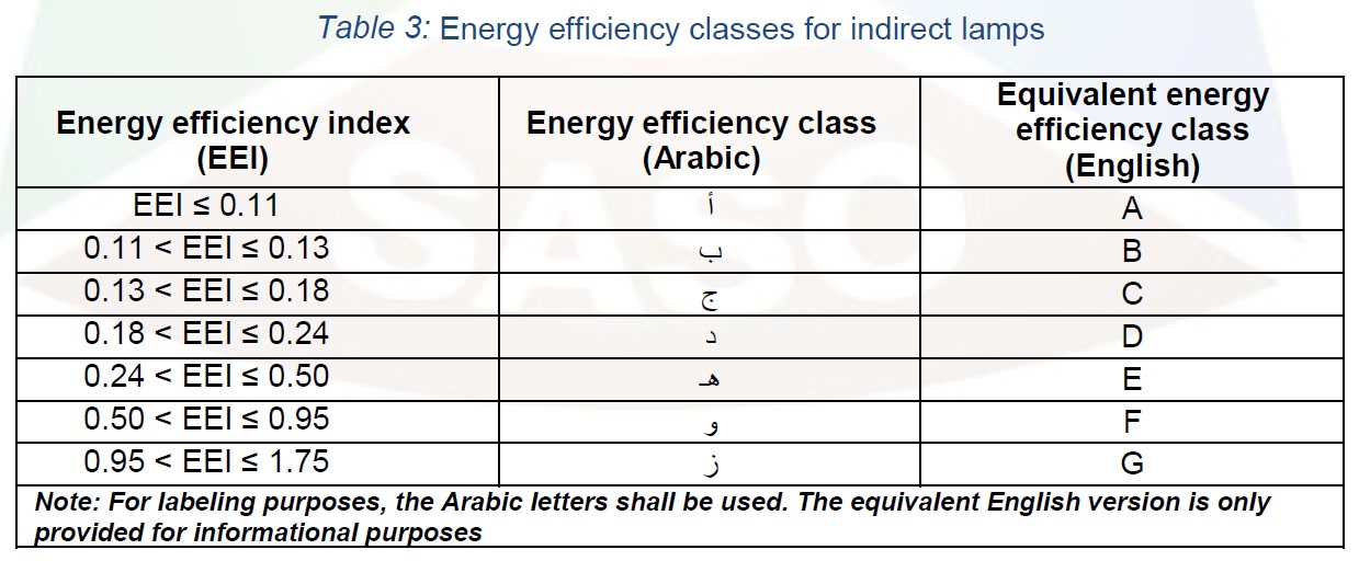 The scope of products controlled by SASO 2870: directional and non-directional incandescent bulbs, self-ballasted compact fluorescent lamps, halogen bulbs, LED bulbs (incandescent replacement), LED bulbs (halogen replacement) for general household or similar applications with a luminous flux between 60 and 12,000 lumens. The Saudi standard SASO -2870: 2015 became mandatory on 1 May 2016. On 8 June 2018, SASO issued Resolution No. 164, which updates the energy efficiency label style for lighting products, amending it to SASO 2870: 2018.